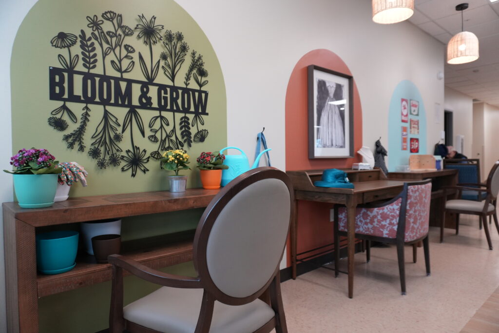 A highlight of the newly enhanced Memory Care space is the addition of interactive life stations—purposeful activity areas that encourage engagement through familiar tasks and experiences. These stations help individuals tap into long-term muscle memory, which research shows can reduce agitation, anxiety, and wandering for those living with memory loss. The space also features cityscape artwork depicting familiar Madison scenes, helping participants reconnect with places and memories that hold meaning in their lives.