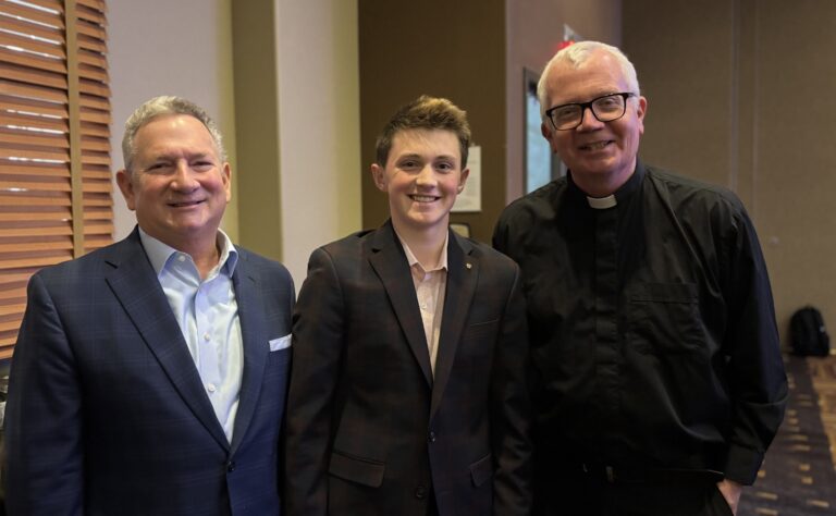 Shawn Carney, Jordan Chesmore, and Bishop Donald J. Hying at the 2026 Youth Faith in Action Scholarship presentation, Frassati Fest.